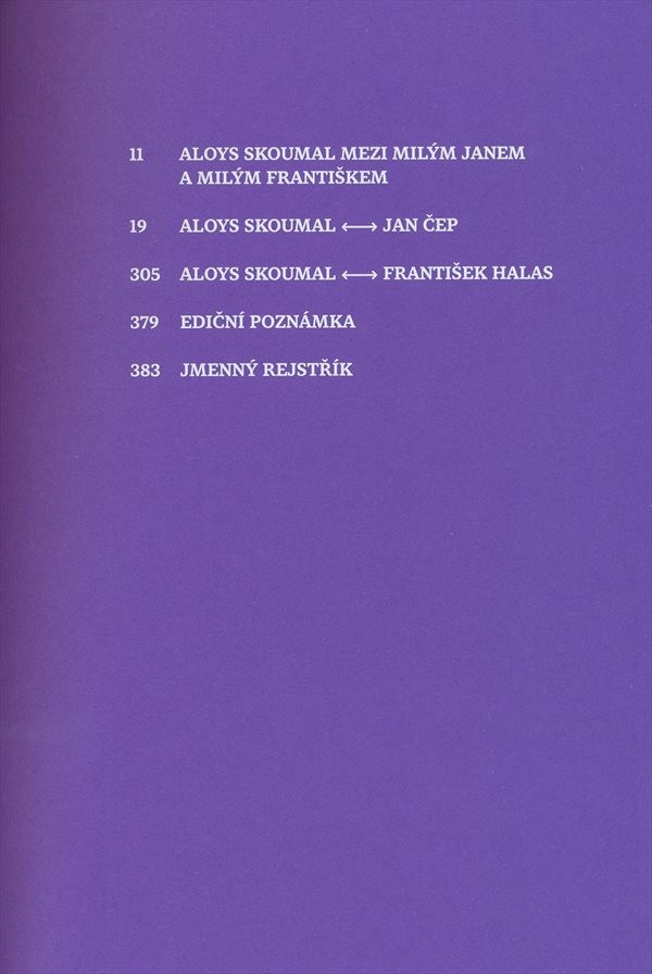 Kniha představuje dosud nepublikované řady korespondence tří významných představitelů české kultury. Publikaci tvoří vzájemná korespondence Aloyse Skoumala a Jana Čepa a Aloyse Skoumala s Františkem Halasem.
