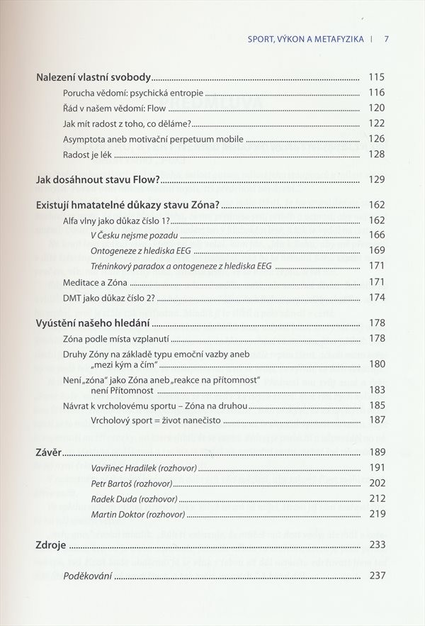 Kniha se však na tento stav dívá netradiční optikou a kombinuje pohled založený na historickém kontextu v kombinaci s nejnovějšími výzkumy různých vědních oborů. Text je bohatě protknut „živými“ příběhy vrcholových sportovců, kteří sdělují vlastní zkušenosti právě s tímto stavem. Nakladatelská anotace.