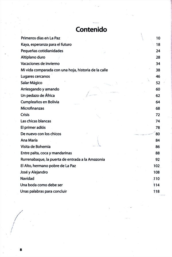 Španělské texty jsou určené pro pokročilé studenty španělštiny. Autorka nás jejich prostřednictvím seznamuje se svými zážitky z práce v dobrovolnictví a rovněž z putování po Bolívii. Na konci každé kapitolky najdeme otázky k textu, přehled mluvnice a slovní zásobu.