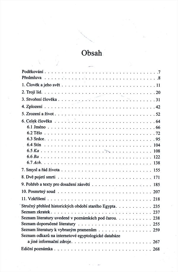 Kniha se věnuje egyptskému pojetí člověka a lidství. Sleduje přitom strukturu navrženou již v prvním díle tak, aby bylo jasně patrné, že Egypťané nahlíželi na všechny kategorie světových bytostí (bohy, blažené zesnulé, žijící i panovníka) shodným způsobem. V úvodu se věnuje postavení lidské bytosti v rámci egyptské kosmologie a ve vztahu k ostatním bytostem. Dále přechází od problematiky stvoření člověka k motivu zrození a jeho náboženské interpretaci. Velký důraz je kladen také na pojetí „složek a projevů“ bytosti, a to jak za života člověka, tak po smrti. Publikace je tematicky završena rozborem egyptských představ o smrti a vzkříšení, přičemž se vrací na svůj začátek skrze téma smrti jako nového zrození. Nakladatelská anotace.