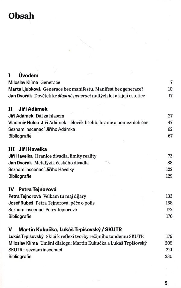 První ucelenější pohled na tvorbu výrazných mladých režisérů - Jiřího Adámka, Jiřího Havelky, Petry Tejnorové, SKUTR a Rostislava Nováka - přináší kromě zasvěcených odborných studií i úvahy tvůrců o své tvorbě, bibliografii a soupisy režií.