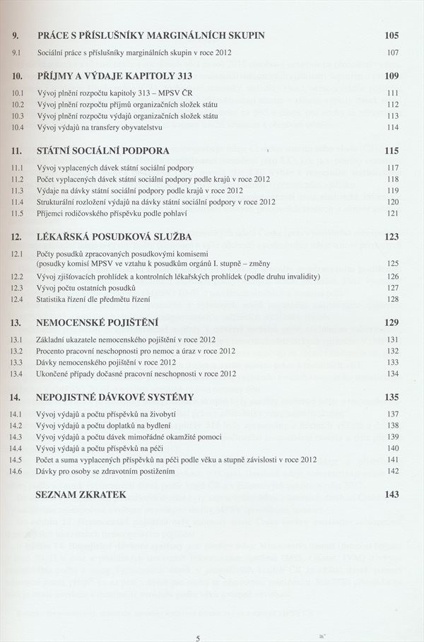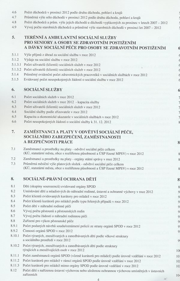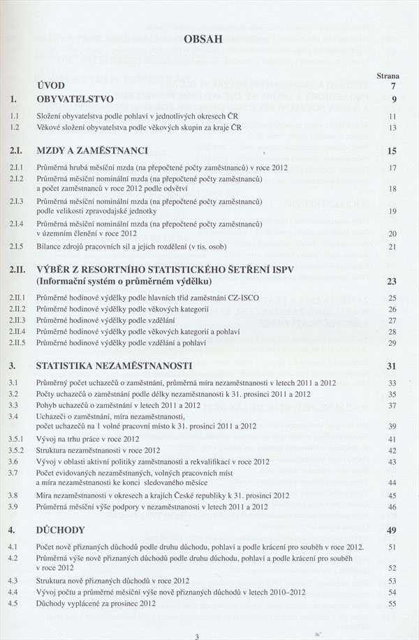 Ročenku tvoří resortní statistika doplněná o vybrané ukazatele z evidence úřadů práce, důchodové statistiky, statistiky mezd, nemocenského pojištění a demografie.
