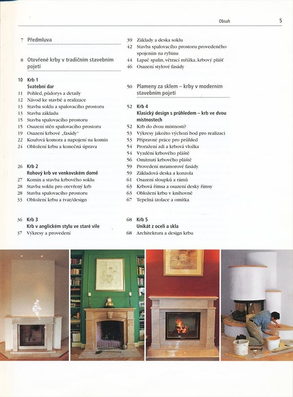Příručka popisuje stavbu tradičních "otevřených" krbů, od venkovského stylu po italský design. Realizaci moderních krbů, kdy jsou plameny za sklem. Otevřené krby ve volném stavebním pojetí (podle vlastních představ zákazníka).