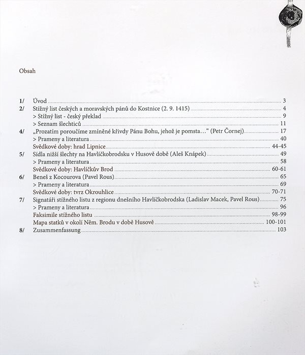 Přepis stížného listu českých šlechticů ze září roku 1415 proti upálení Jana Husa a kapitoly věnované historickým souvislostem této listiny.