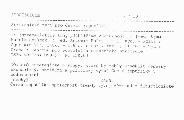 Výsledky vědeckého výzkumu mezioborového týmu, který se zabývá analýzou současných problémů i perspektivních vývojových možností české společnosti. Pojmenovává některé faktory, které mohou působit jako stimul rozvoje v podmínkách moderního globalizovaného světa - občanské uvědomění, sociální soudržnost, rozvoj vědy, konkurenceschopná adaptabilní ekonomika, efektivní systém veřejné správy atd.