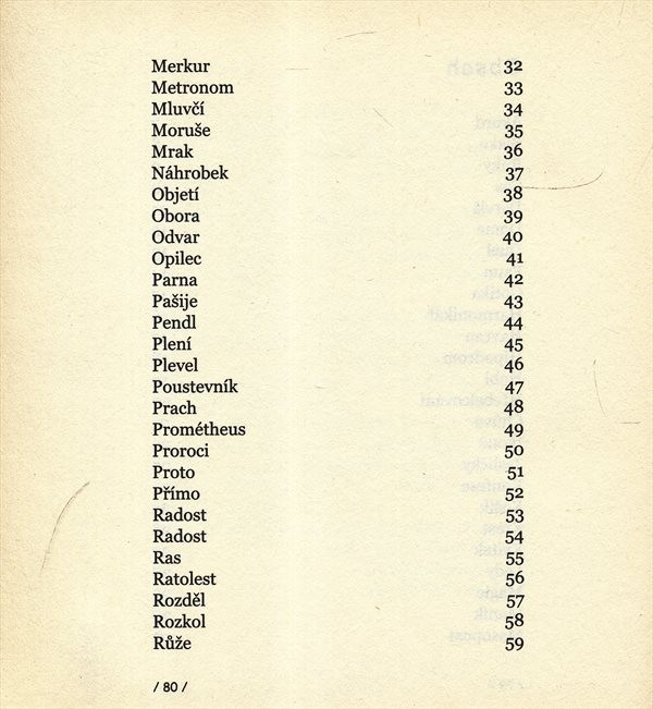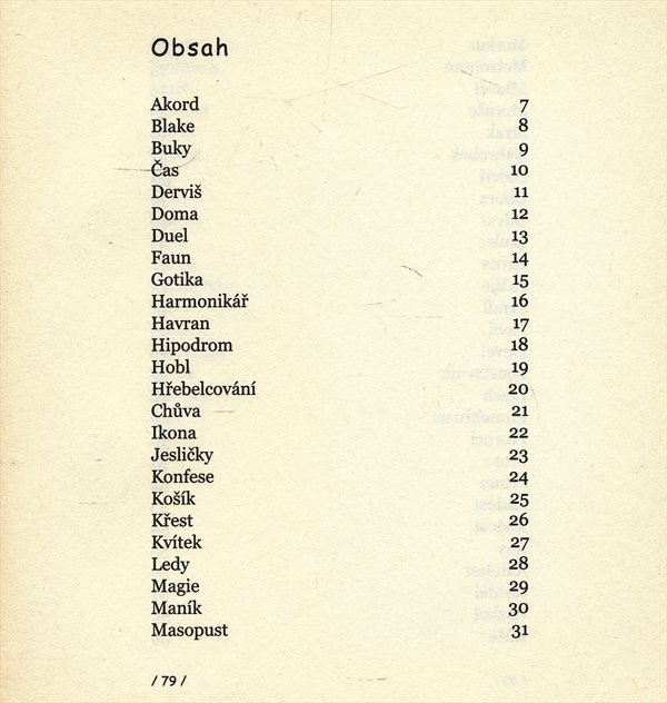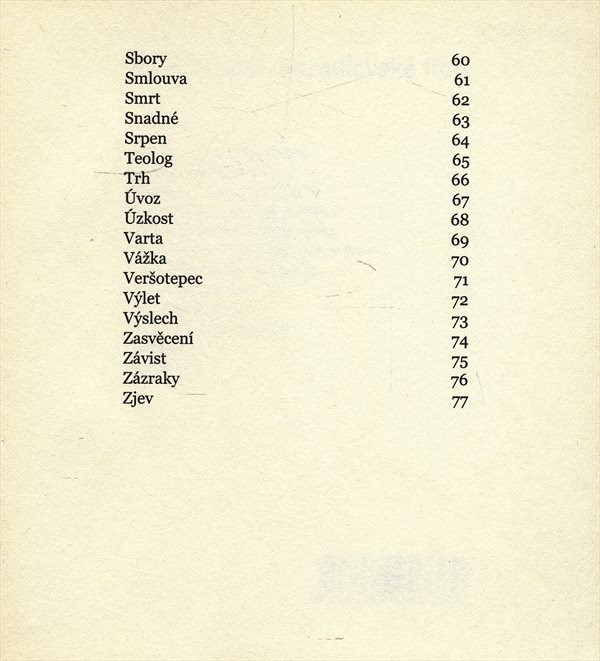 | Název dílčí části | Akord --; Blake --; Buky --; Čas --; Derviš --; Doma --; Duel --; Faun --; Gotika --; Harmonikář --; Havran --; Hipodrom --; Hobl --; Hřebelcování --; Chůva --; Ikona --; Jesličky --; Konfese --; Košík --; Křest --; Kvítek --; Ledy --; Magie --; Maník --; Masopust --; Merkur --; Metronom --; Mluvčí --; Moruše --; Mrak --; Náhrobek --; Objetí --; Obora --; Odvar --; Opilec --; Parna --; Pašije --; Pendl --; Plení --; Plevel --; Poustevník --; Prach --; Prométheus --; Proroci --; Proto --; Přímo --; Radost --; Ras --; Ratolest --; Rozděl --; Rozkol --; Růže --; Sbory --; Smlouva --; Smrt --; Snadné --; Srpen --; Teolog --; Trh --; Úvoz --; Úzkost --; Varta --; Vážka --; Veršotepec --; Výlet --; Výslech --; Zasvěcení --; Závist --; Zázraky --; Zjev |