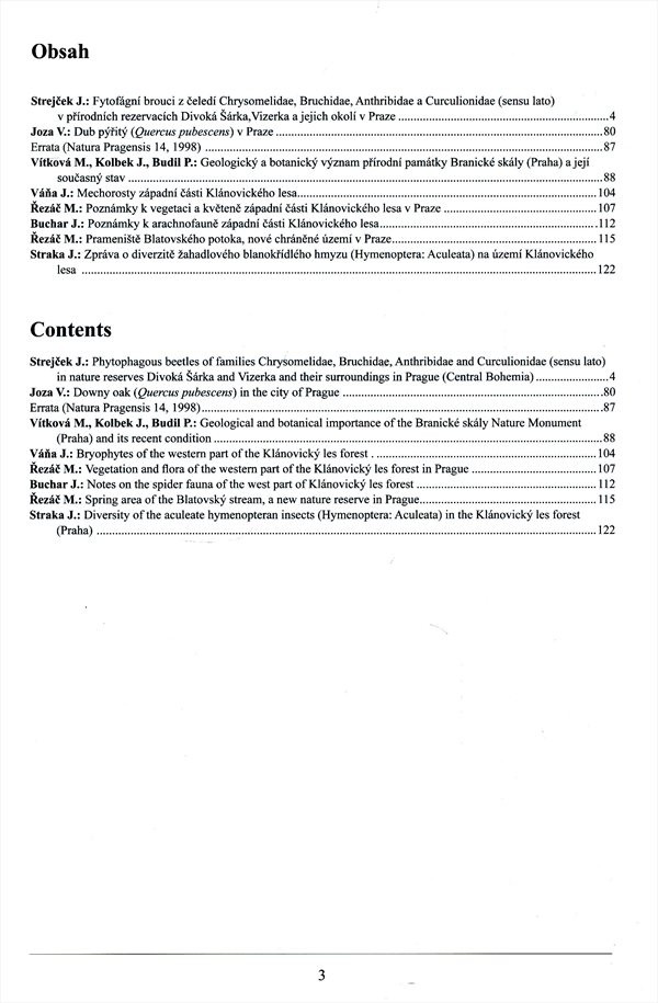Příspěvky sborníku přírodovědných studií se věnují flóře a fauně na území Klánovického lesa, prameništi Blatenského potoka, výskytu dubu pýřitého v Praze a významu přírodní památky Branické skály.