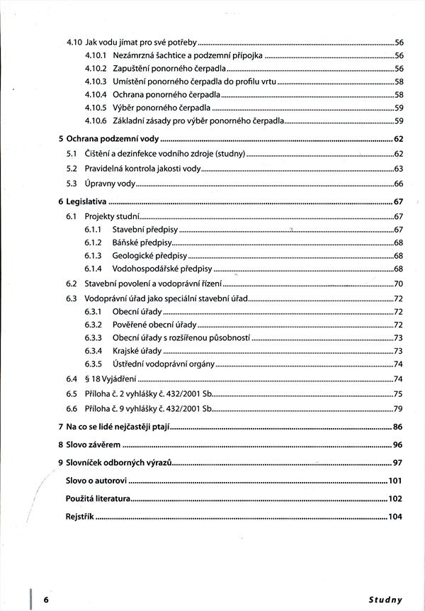 Popisuje základní typy zdrojů pitné vody, jejich výhody i nevýhody a nezapomíná ani na způsoby hledání pramene či výběr vhodného čerpadla. Publikace vás také seznámí se souvisejícími platnými zákony, vyhláškami a normami, jimiž je třeba se při stavbě studní řídit. Kapitola otázek a odpovědí vám rychle poradí s případnými problémy. Nakladatelská anotace.