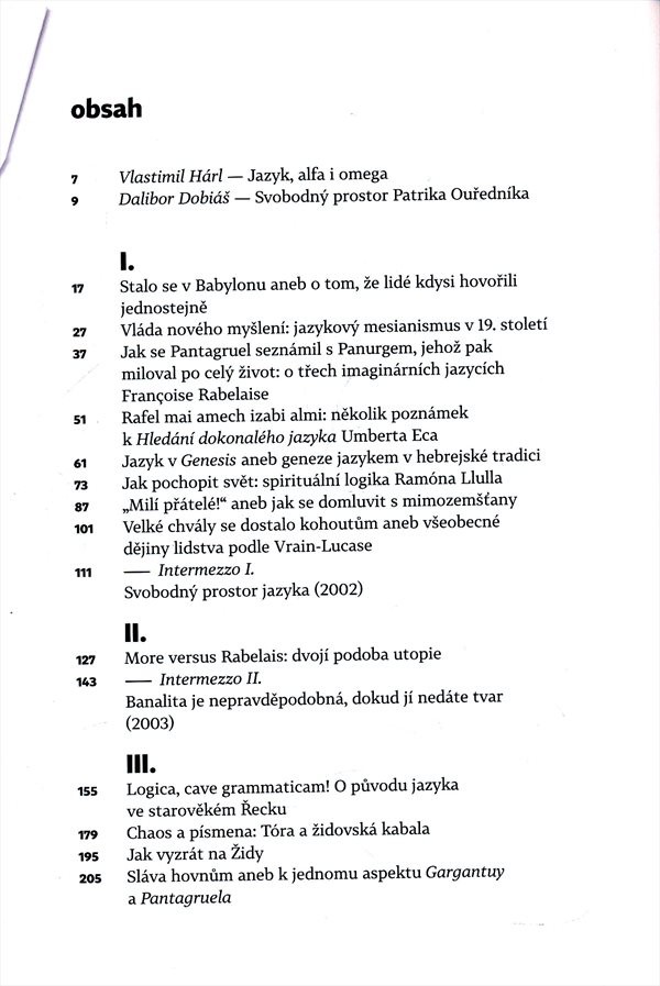 Vznikl tak mimořádně cenný a podnětný svazek. Kniha je členěna do pěti oddílů: první oddíl přináší texty o obecných otázkách jazyka a překladu, druhý je věnován Rabelaisovi a problematice jazyka v jeho díle, třetí sestupuje hluboko do minulosti ("O původu jazyka ve starověkém Řecku"), čtvrtý se vyjadřuje k jazyku dnešnímu, poukazuje na ledabylé zacházení se slovy v naší současnosti a věnuje se i otázce uchování paměti umožněné jazykem, pátý představuje několik jazykově-literárních kuriozit s hlubším obsahem. Kniha má všechny přednosti pečlivě komponovaného svazku: jednotlivá témata se doplňují a vzájemně nasvěcují, celek vypovídá o mnohaletém a soustavném autorově zájmu o danou problematiku. Nakladatelská anotace. Kráceno.