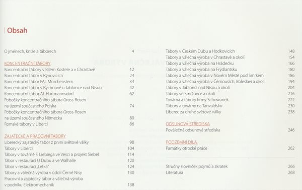 Kapitoly mapují historii koncentračních, zajateckých, pracovních a také internačních táborů nejen v oblasti Liberecka nebo Jablonecka, ale i v přilehlých částech Polska a Německa.