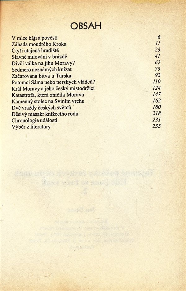 Historickými prameny pro české dějiny 8.-10. věku jsou pouze Kosmova a Hájkova kronika, zmínky v cizích letopisech, archeologické nálezy a etymologie místních i osobních jmen. Autor srovnává výklady těchto pramenů k jednotlivým událostem od knížete Kroka, přes sedm bájných českých knížat (od Nezamysla po Hostivíta) a nejasnosti Velkomoravské říše po sjednocení českého státu vyvražděním Slavníkovců roku 995. Autor ponechává čtenáři na posouzení, který výklad je vědečtější či pravděpodobnější. Obrázky v textu, chronologický přehled událostí, použitá literatura.