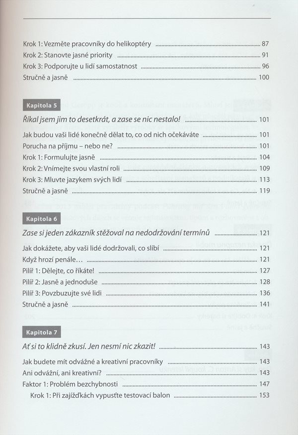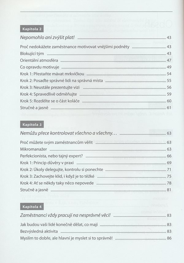 Jak konečně získáte čas na to, co je opravdu důležité? Proč nejsou vaši pracovníci aktivní? Proč se vám je nedaří motivovat? Na tyto a další otázky, klíčové pro každého šéfa a každou firmu, vám odpoví tato mimořádná kniha. Zjistíte díky ní, že mít vše neustále pod kontrolou, řešit provozní věci a snažit se předcházet všem chybám a nezdarům vede k jedinému: vy, vaši lidé a celá firma zůstáváte daleko za svými možnostmi! Vaše přepracování, stres a možná i mimopracovní problémy – to jsou další plody vaší „nenahraditelnosti“ a špatných pracovních návyků. Změňte je! Přestaňte pracovat za své podřízené a nechte je učit se chybami – dlouhodobě se vám to jednoznačně vyplatí. Neobávejte se samostatnosti svých lidí. Když jim ji poskytnete za správných podmínek, budou zodpovědní, kreativní, motivovaní a přinesou dobré výsledky. Nakladatelská anotace. Kráceno.