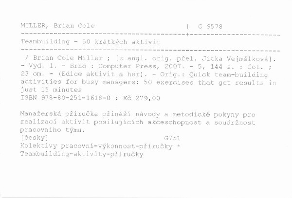 Teambuilding, budování a posilování pracovního týmu na základě společně sdílených aktivit, patří mezi populární moderní metody personálního managementu. Bohužel však bývá tato metoda náročná. Proto se autor snaží oslovit svojí knihou zaneprázdněné manažery a nabízí jim 50 přibližně patnáctiminutových aktivit, které nevyžadují speciální přípravy. Příručka je koncipována přehledně - popisy, včetně metodických pokynů a rad ohledně zvládnutí případných problémů, doprovázejí piktogramy informující o podmínkách jednotlivých aktivit.