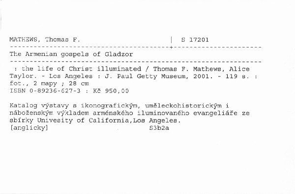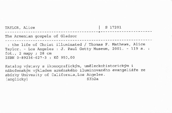 Katalog výstavy s ikonografickým, uměleckohistorickým i náboženským výkladem arménského iluminovaného evangeliáře ze sbírky Univesity of California,Los Angeles.