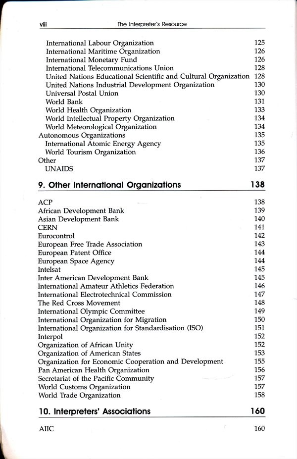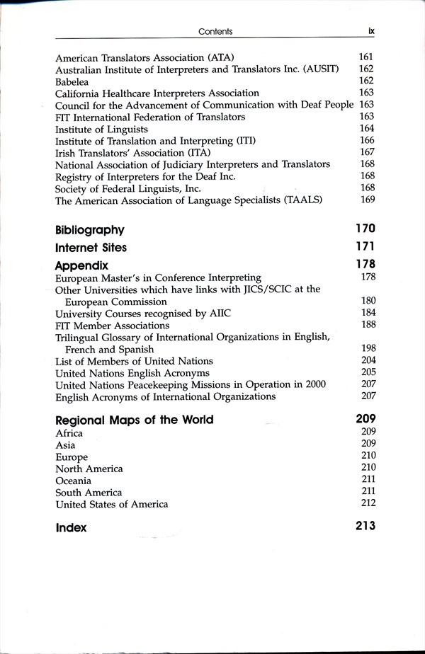Kromě základních podmínek pro určitý typ tlumočení v jednotlivých zemích informuje příručka o řadě mezinárodních organizací, které zaměstnávají tlumočníky (EU, OSN apod.) s adresami a webovým spojením (název je uveden v angličtině, francouzštině a španělštině). Zveřejňuje charakteristiky i adresy a webová spojení národních a mezinárodních sdružení tlumočníků a překladatelů a seznam členů OSN s anglickými názvy a používanými zkratkami jejích jednotlivých organizací, rad a komisí.V knize najdeme i etický kodex 5 profesionálních tlumočnických organizací a seznam univerzit, které pořádají postgraduální kurzy pro tlumočníky a jsou uznány mezinárodní asociací konference tlumočníků (AIIC). G7b MM