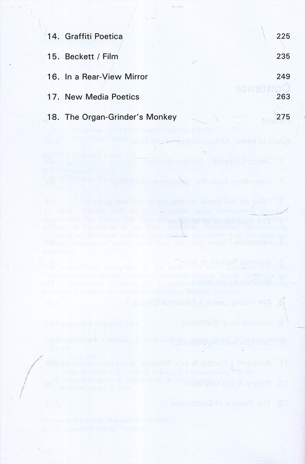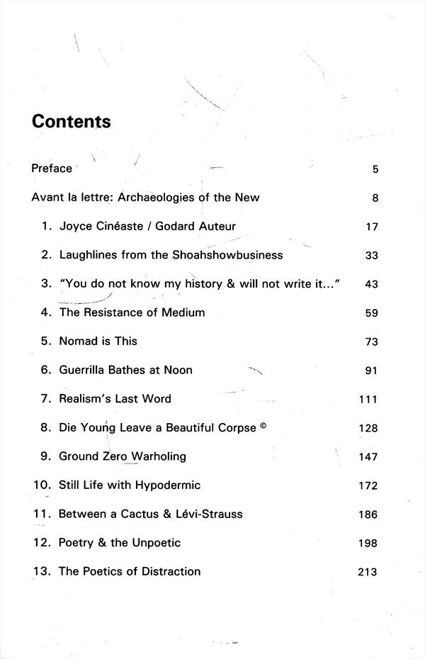 Autor zkoumá stav postavangardy v dílech filozofů, spisovatelů, umělců nebo filmových tvůrců; např. R. Rauschenberga, Andy Warhola, Charlese Olsona nebo Michaela Dransfielda.
