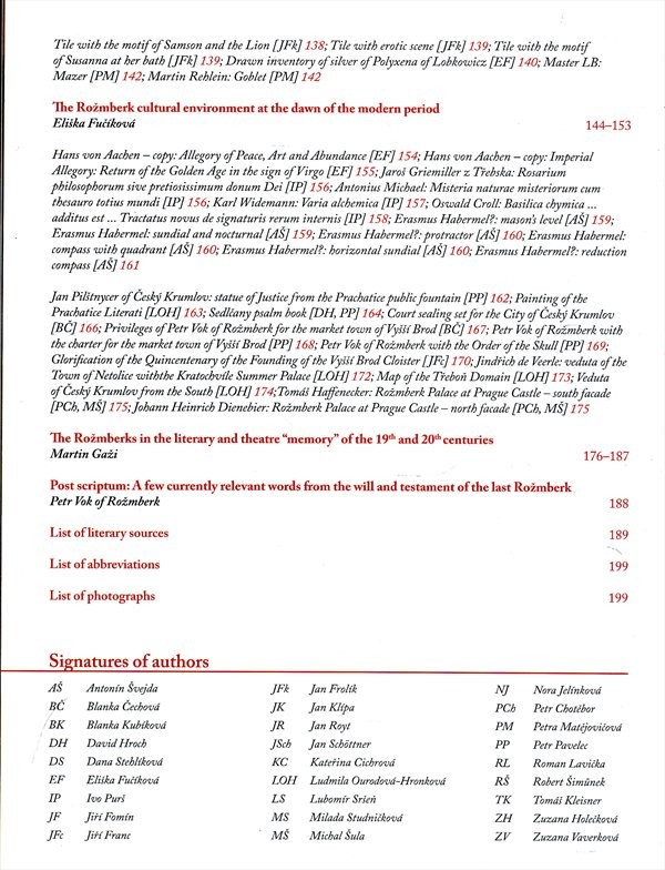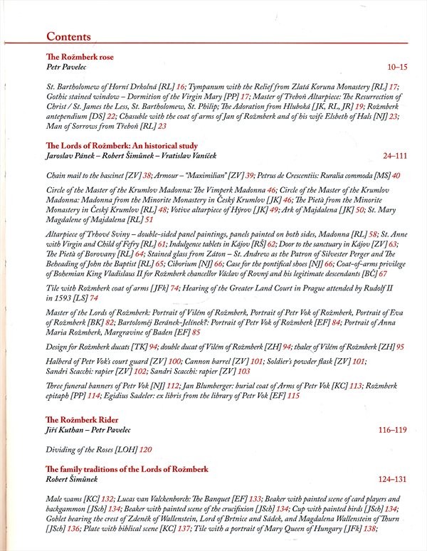 Publikace je z větší části zaměřena na dějiny Rožmberků od 12. století až do vymření rodu v roce 1611. Zabývá se rovněž životními osudy významných příslušníků tohoto rodu zasazené do širšího kontextu českých dějin středověku a raného novověku. Další části této monografie se dotýkají stavebních i uměleckých počinů vladaře rodu Viléma z Rožmberka a jeho bratra Petra Voka, rožmberských rodových tradic, obrazů Rožmberků v české literatuře a divadelních hrách 19. a 20. století nebo motivu rožmberské jezdecké pečeti.Text doplňují fotografie vystavovaných předmětů.