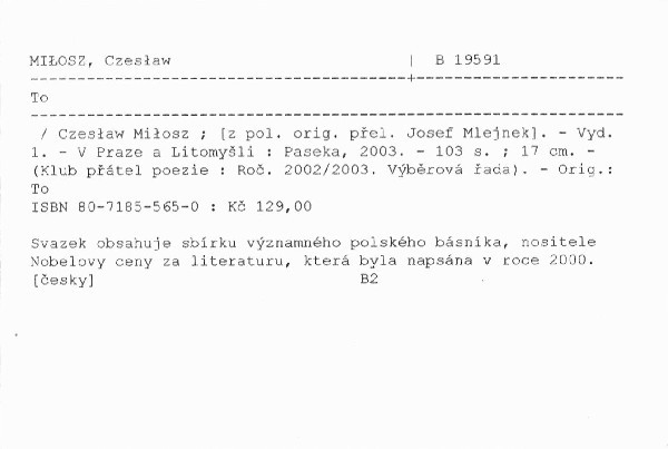 I když se jedná již o devátou Miloszovu knihu vydanou v českém překladu, je třeba připomenout, že českému čtenáři se vlastně tento autor představuje poprvé svou původní básnickou sbírkou. Lapidárně pojmenovaný svazek veršů "To" lze považovat za jeden z vrcholů Miloszovy "ponobelovské" tvůrčí etapy. Devadesátiletý básník, působící nyní jako emeritní profesor slovanských jazyků na Kalifornské univerzitě v Berkeley, se zde s fascinující ostrostí pohledu ohlíží za svou životní poutí, básnickými druhy a tragikou i krásou světa, do jejichž podstaty se s trvalým, často polemickým zápalem opětovně pokouší proniknout. Navíc je Miloszův vnitřní svět často prodchnutý nelítostně hořkými vzpomínkami a úvahami, "poněvadž TO znamená narážet na kamennou zeď / a pochopit, že tato zeď neustoupí žádné naší prosbě." šink