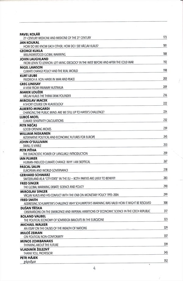 Sborník abecedně řazených textů podle příjmení autorů od více než padesáti osobností z oblasti politiky, ekonomie, filozofie, přírodních věd nebo podnikání. Jedná se o pestré spektrum textů, jejichž autoři se věnují samotné osobě V. Klause, evropské integraci, ekonomickému a politickému vývoji v naší zemi po listopadu 1989, jednotné evropské měně, klimatickým změnám, ekonomickým otázkám nebo celé řadě dalších témat ze současnosti.