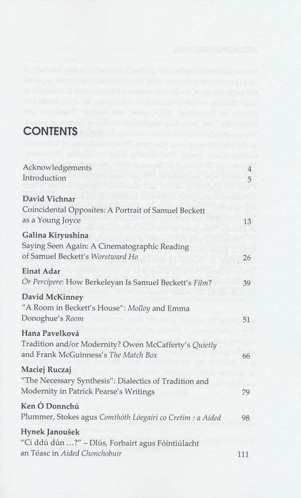 Sborník esejů věnovaných irské literatuře. Zvláštní pozornost je věnována dílům J. Joyce, P. Pearse, Ch. Plummera, E. Donoghue nebo S. Becketa.