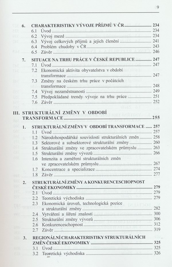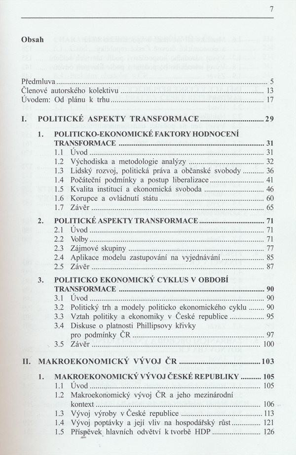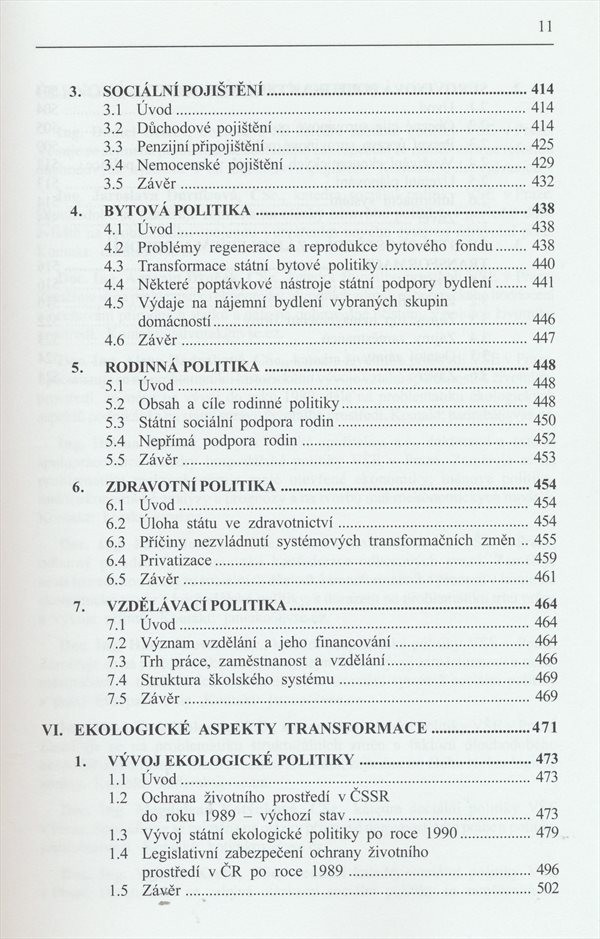 Kapitoly rozebírající průběh transformačního procesu v České republice během 90. let minulého století z politického, makroekonomického, ekologického a rovněž sociálního hlediska.