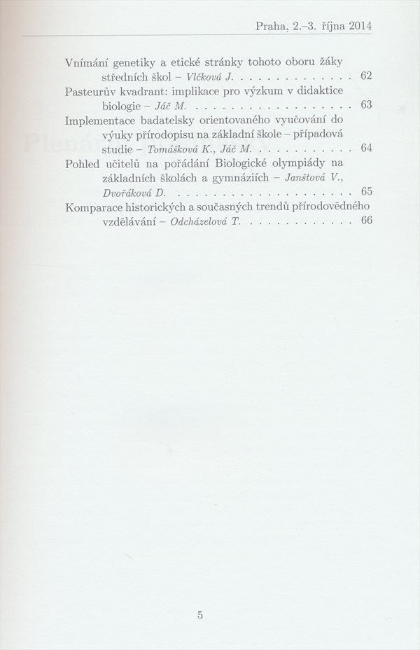 | Podnázev | konference k 20. výročí obnovení činnosti katedry biologie a environmentálních studií na Pedagogické fakultě Univerzity Karlovy v Praze, Praha 2.-3. října 2014 : sborník abstraktů |