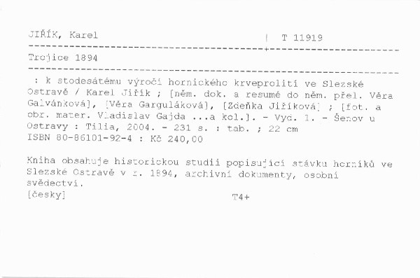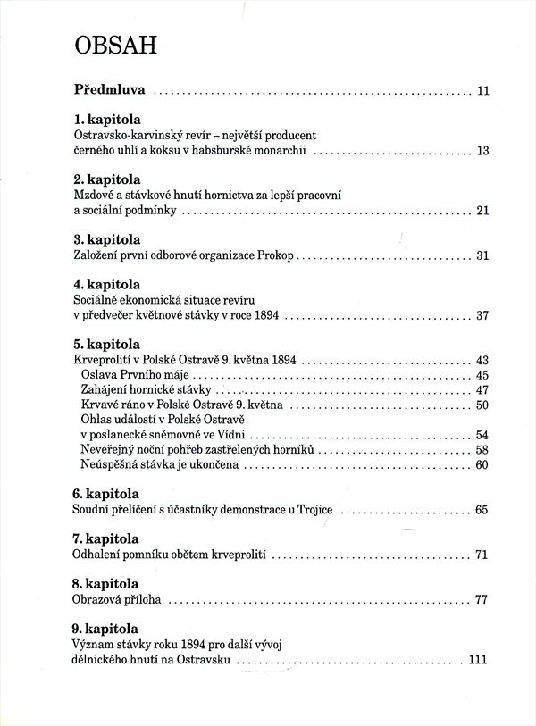 Kniha obsahuje historickou studii popisující stávku horníků ve Slezské Ostravě v r. 1894, archivní dokumenty, osobní svědectví.