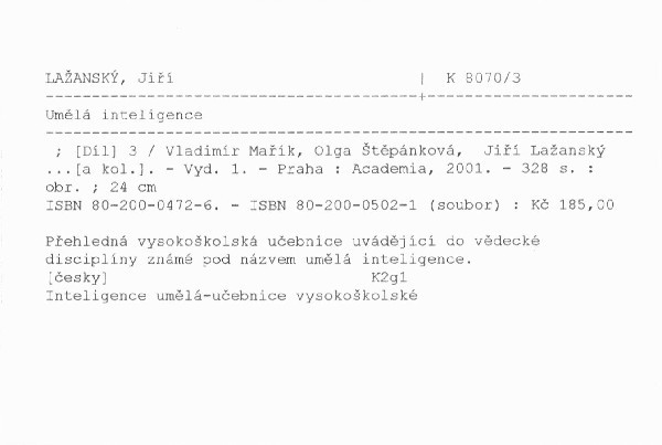 Třetí díl knihy si klade za cíl pojednat o výše uvedeném tématu z následujících hledisek. Je zdůrazněn zvláště filozofický přístup k vymezení oblastí přirozené a umělé(strojové) inteligence. Opomenuta nejsou teoretická východiska související s počítačovým modelováním ve světě jak biologických systémů, tak společenských systémů lidské organizace. Závěrečná část knihy tematicky prostupující obě předcházející části podává odborný výklad teoreticky složité problematiky matematické formalizace a výpočetní náročnosti algoritmů umělé inteligence a jejich praktické využití při řešení úloh odkazujících na modelové situace v jednotlivýc oblastech lidské činnosti. Kniha obsahuje rozsáhlé přehledy referenční literatury, rejstřík a anglicko-český slovník používaných pojmů. K2g1 11.5.2001 simcikog
