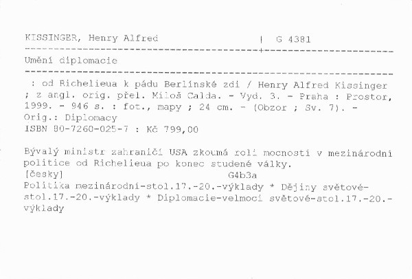 | Autor | Henry Kissinger ; [z angl. orig. přel. Miloš Calda] |