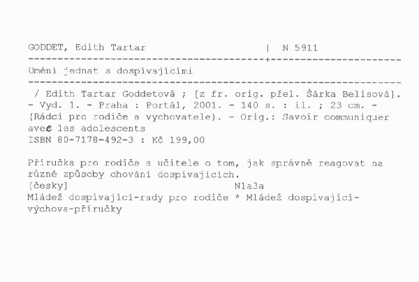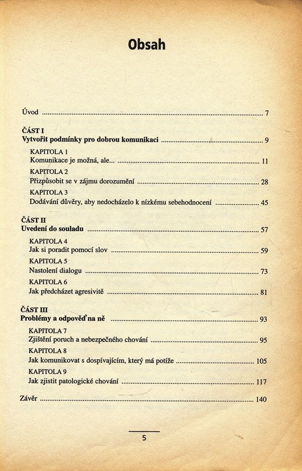 Přehledná, rozumná, zajímavá a dobře srozumitelná příručka pro rodiče, učitele a vychovatele představuje způsoby chování dospívajících i různé reakce dospělých na toto chování. Kniha je rozdělena do tří částí - první část knihy informuje o podmínkách, které je nutno splnit, aby komunikace mezi dospívajícími a dospělými byla vůbec možná a měla smysl. Druhá část popisuje situace, kdy chování adolescentů dospělé popouzí, dráždí nebo vyčerpává. Třetí část knihy pojednává o komunikaci s dospívajícími, kteří mají psychologické nebo sociální potíže, které narušují jejich vývoj. Odborný (ale dobře srozumitelný text) je doplněn mnoha příklady z praxe, radami a komentáři. 15.5.2001 Selinges