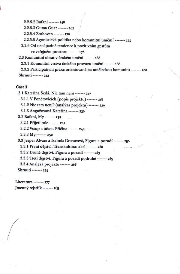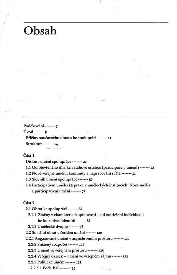 Autor analyzuje trojí obrat (obrat ke spolupráci, sociální obrat a komunitní obrat), zabývá se působením uměleckých skupin a dvojic vystupujících jako jeden nadindividuální autorský subjekt, připomíná rostoucí zájem současných umělců o sociální a politická témata. Publikace obsahuje i trojici případových studií věnovaných vybraným uměleckým projektům Kateřiny Šedé, skupiny Rafani, Jespera Alvaera a Isabely Grosseové.