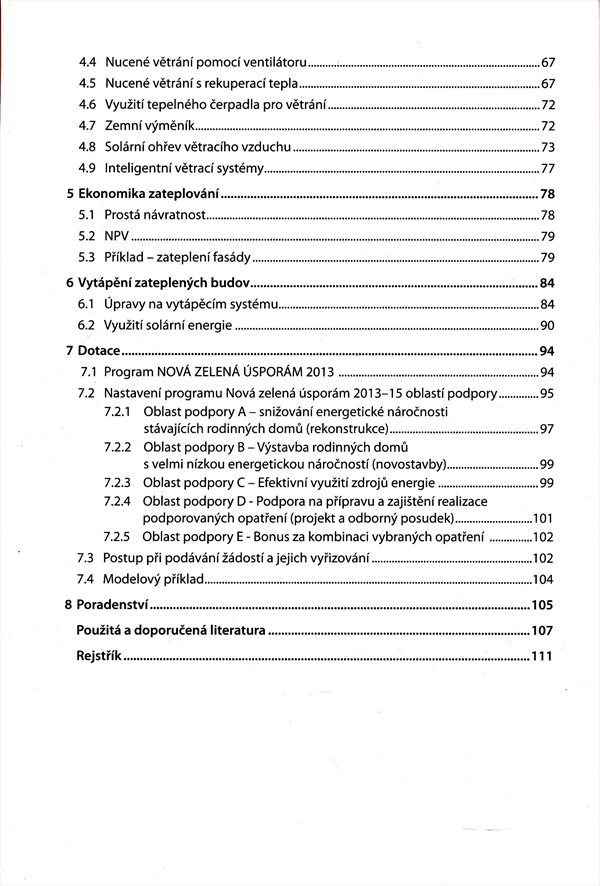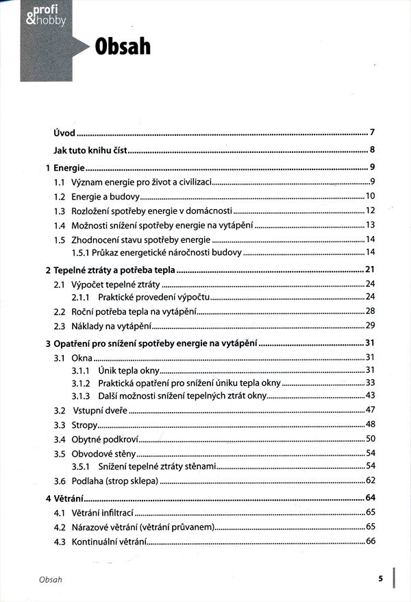 Kniha se snaží vysvětlit, jak nejlépe dosáhnout snížení spotřeby a co ji nejvíce ovlivňuje, jak spotřebu minimalizovat volbou vhodného zateplení, oken a vytápění. Jaký materiál zvolit při konstrukci nebo rekonstrukci domu, jakou funkci plní větrání, jak si snadno vypočítat spotřebu ve své domácnosti a jaké dotace jsou v dnešní době k dispozici v rámci programu Nová zelená úsporám 2013.