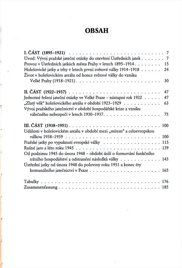 Kromě vlastního areálu v Holešovicích se autor zaměřuje i na dějiny pražského masného průmyslu, firmy, které v oboru působily i na projekty jatek v jiných částech Prahy. Součástí publikace jsou černobílé fotografie a statistické přehledy výkonnosti jednotlivých provozů. Závěr obsahuje shrnutí v němčině.