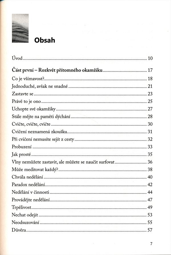 Autor se zabývá meditací, která je považována za srdce buddhistických meditací. Ať jste kdekoliv, probouzí ve vás jedinečnou krásu a možnosti přítomného okamžiku. Ukazuje, jak nám tyto jednoduché meditační techniky umožní být opravdu v kontaktu s tím, kde se nyní nacházíme. Jon Kabat-Zinn vysvětluje, co je všímavost, jak jí dosáhnout pomocí jednoduchých meditačních technik, jak s vědomím meditace zlepšit každý aspekt svého života a jak do něj všímavost začlenit. Nakladatelská anotace. Kráceno.