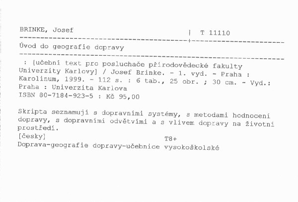 Skripta seznamují s dopravními systémy, s metodami hodnocení dopravy, s dopravními odvětvími a s vlivem dopravy na životní prostředí.