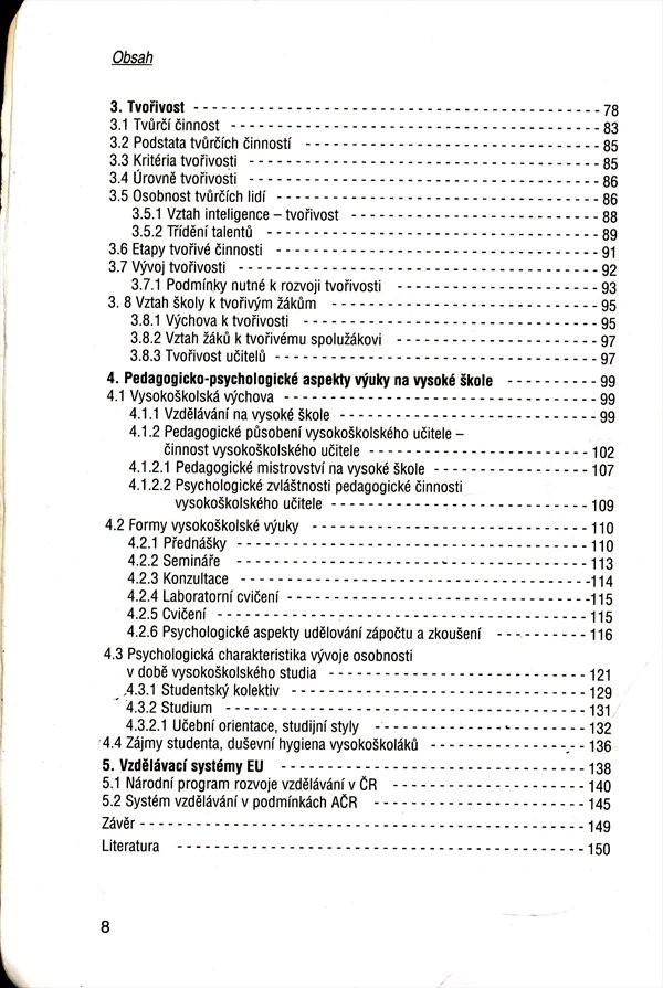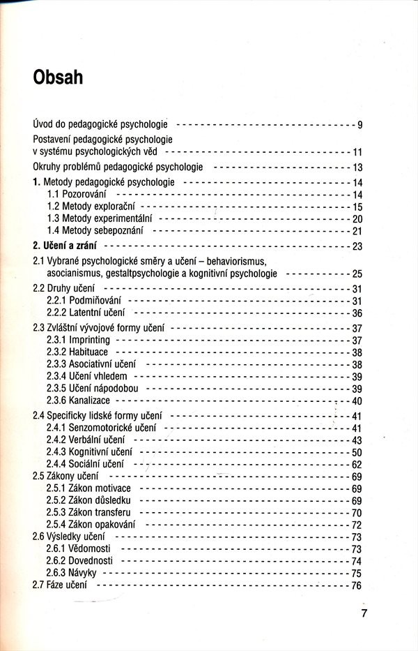 Studijní text se zabývá převážně psychologií učení, pedagogickými otázkami tvořivosti a specifickými formami výchovy a výuky na vysoké škole.