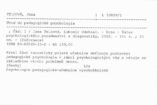 Vydání: Ústav psychologického poradenství a diagnostiky 2002 | Jazyk: čeština | Signatura: L 10809/1