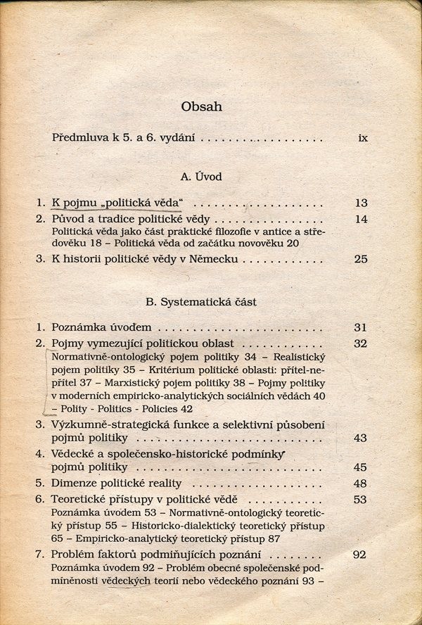 Studijní text se člení do čtyř základních oddílů. První rekapituluje vznik a vývoj vědeckého oboru především z hlediska německého jazykového prostoru. Následující část interpretuje podstatu politické vědy a teoretických přístupů. Třetí oddíl systematicky popisuje jednotlivé oblasti. Závěrečná kapitola naznačuje praktické využití politické vědy ve vyučování a politice. Shrnutí základních poznatků z politické teorie pro studenty společensko-vědních oborů.