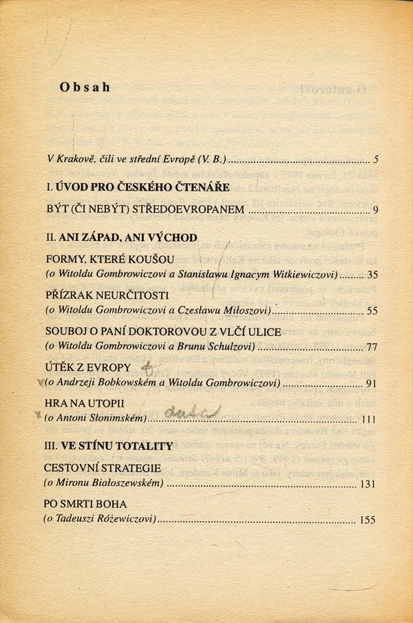 Autor esejů, proslulý polský literární vědec, kritik, historik a esejista je vykladačem polského i středoevropského literárního kontextu generace po Michalu Glowińském. Autor je znám především jako propagátor a vykladač díla Czeslava Milosze, který ovlivňuje vývoj polského písemnictví od třicátých let, a jemuž je zde věnováno několik esejů. V úvodu pro českého čtenáře se autor zamýšlí nad povahou středevropanství a otázkou popularity této myšlenky v Polsku. Esej o formách analyzuje některé jevy v dílech i životech osobností W.Gombrowicze, S.I. Witkiewicze a B.Schulze. Problematika emigrace a literární tvorby je zvažována prostřednictvím děl A.Bobkowského a W.Gombrowitze. Esej Hra na utopii sleduje individuální postavení A.Slonimského, jeho originalitu a volnost ve zužujícím se prostoru předválečného Polska. Eseje o literatuře v totalitě představují díla M.Bialoszewského, T.Rózewicze a T.Konwického. Esej Stav ohrožení vypovídá o próze výjimečného stavu (po vystoupení Solidarity), což téměř klinicky reflektují díla Nowakowského, Bocheńského, Szczypiorského a Andermana. Literatura tohoto období dbá na společenskou reprezentativnost hrdinů a na dějovou scénu vnáší obraz Boha. Následujíci esej je věnovaný reálnému socialismu v polském literárním kontextu. Tři eseje o pohraniční literatuře představují J. Brodského, M. Kunderu a D. Kiše. Závěrečný esej prezentuje postmoderní trendy v polské literatuře.