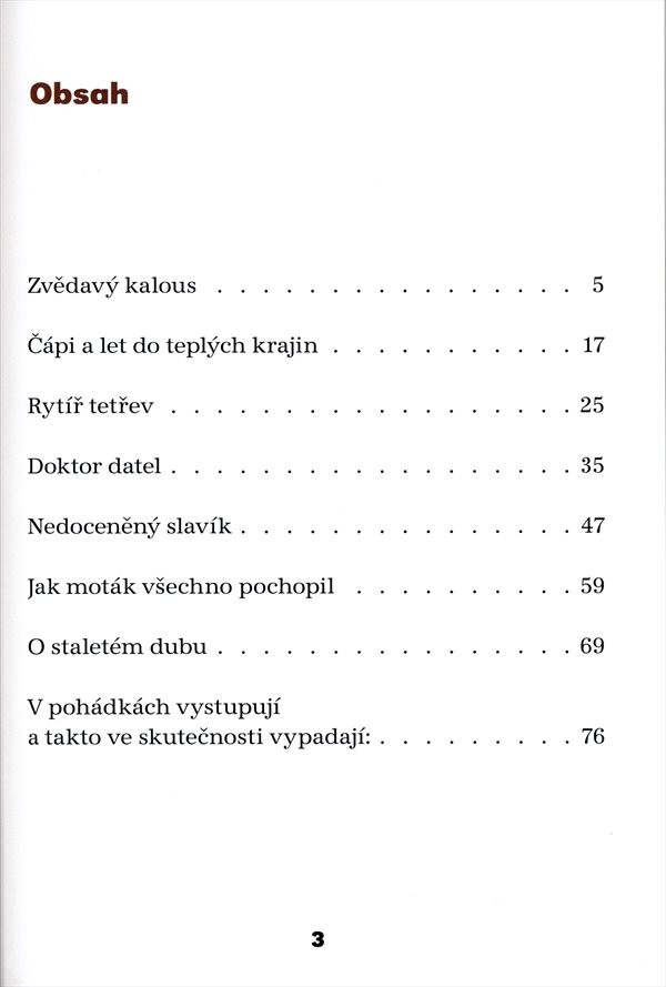 Zvědavý kalous, který místo péče o mláďata shání klepy, slavík, jehož zpěvu ostatní nechtějí naslouchat a řada dalších postaviček ze světa ptáků se představuje v pohádkovém vyprávění i barevných ilustracích. V závěru knížky jsou pak připojeny realistické kresby několika z nich.