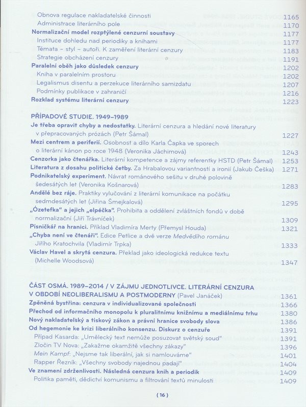 Výklad je chronologicky rozdělen do osmi částí. Na úvod každé z nich je zařazena rámcová kapitola, která podává obecný přehled o podobě a proměnách cenzury daného období. Soustředí se přitom především na instituce, které cenzuru vykonávají, a na dopady této regulace na fungování dobového literárního provozu. Za každou rámcovou kapitolou následuje blok případových studií, které na vybraných tématech ukazují působení literární cenzury v detailu. Autorský tým, který v roce 2012 připravil k vydání překladovou antologii teoretických textů Nebezpečná literatura?, při práci na knize vstřebal diskuse o povaze cenzury, jež v humanitních vědách probíhají od šedesátých let 20. století. Nakladatelská anotace. Kráceno.