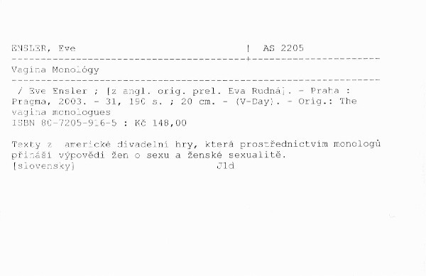 | Autor | Eve Ensler ; [z angl. orig. prel. Eva Rudná] |
