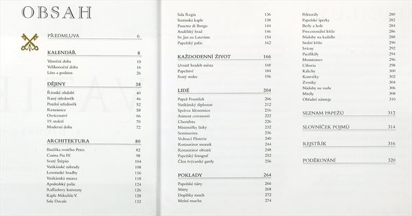 Vatikánské slavnosti a svátky v průběhu liturgického roku. Dějiny papežství. Významné vatikánské stavby, jejich architektura a výzdoba interiérů (např. bazilika sv. Petra, Apoštolský palác, Sixtinská kaple, Andělský hrad ad.). Běžný život Vatikánu. Jeden den v životě představitelů papežského státu a zaměstnanců Vatikánu (pracovní den diplomata, správce klenotnice, asistenta ceremonií, seminaristy, restaurátora či papežského fotografa a mnoha dalších). Poklady papežské sakristie (liturgické předměty, oděvy, papežské insignie). - Kvalitní barevné fotografie jsou doprovázeny stručnými vysvětlujícími texty.