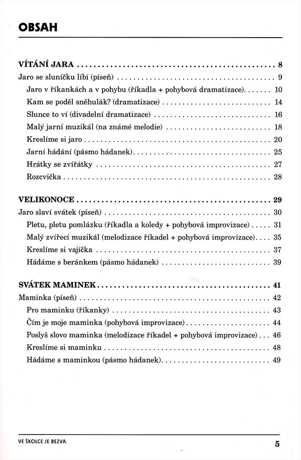 Písničky, básničky, hry, pohybové improvizace a divadelní dramatizace. Publikace je rozdělena podle ročních období (letní hrátky, vítání jara) a událostí v roce (karneval, vánoční čas).