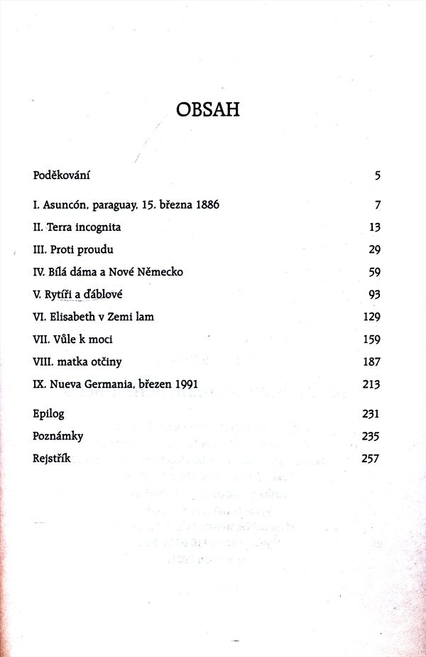Elisabeth Nietzschová měla vliv nejen na svého bratra, proslulého filozofa Friedricha Nietzscheho, ale i na jeho filozofii. Snažila se proslavit svého bratra i jeho filozofii a ještě za jeho života založila Nietzschův archiv ve Výmaru. Díky její činnosti využili nacisté Nietzschovu filozofii pro svou ideologii. Autor se ve své práci rovněž věnuje historii projektu Elisabet Nietzschové a jejího manžela Bernharda Förstera, kteří v 80. letech 19. založili uprostřed Jižní Ameriky kolonii Nové Německo (Nueva Germania), která měla být líhní nového germánského ducha a inspirací pro celý jihoamerický subkontinent. Součástí výkladu je také autorovo pátrání po potomcích německých kolonistů žijících v Paraguayi. Fotografie, rejstřík a poznámkový aparát.