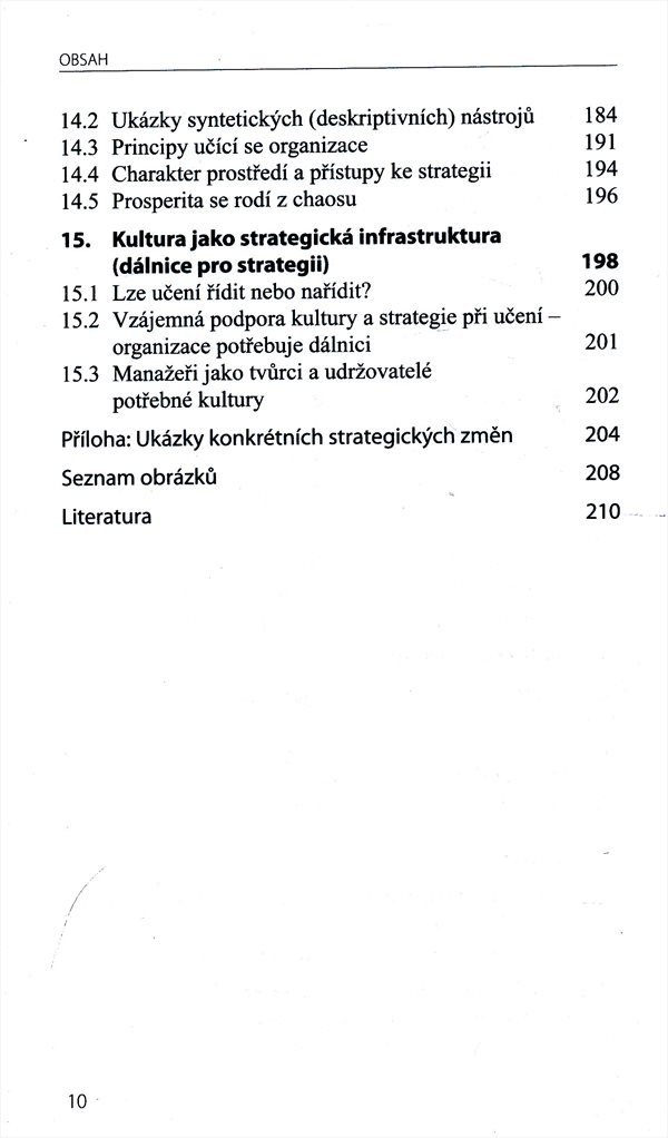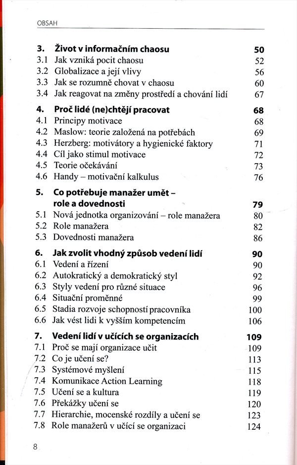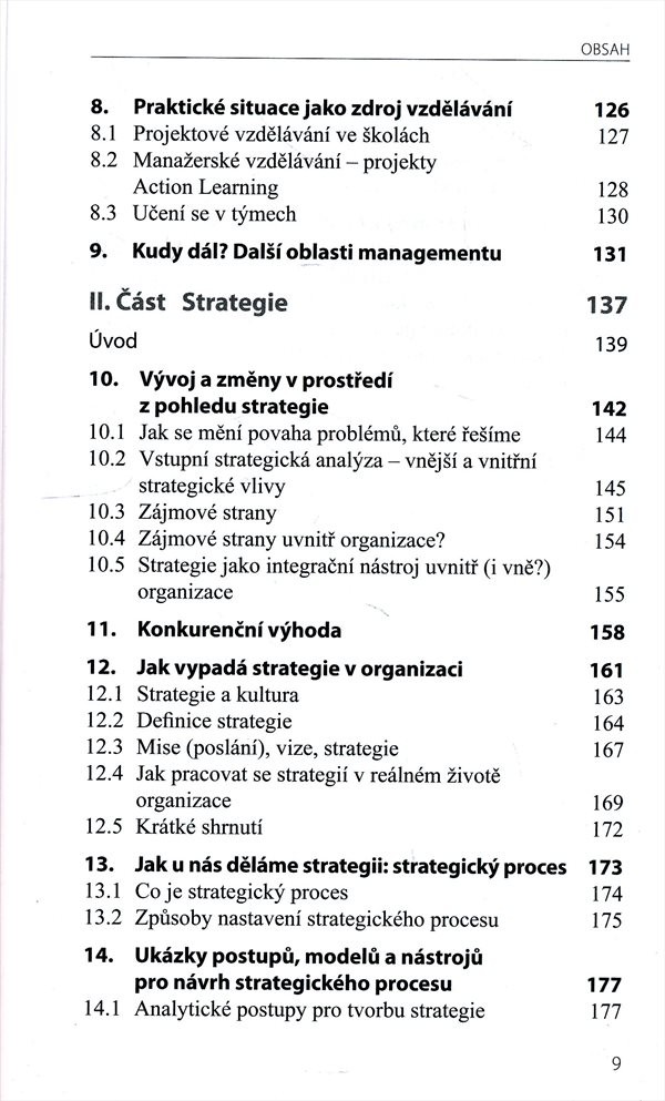 První část knihy se věnuje vymezení pojmu manažer a management, manažerským koncepcím v minulosti, manažerským dovednostem, způsobům vedení lidí, problematice vedení lidí v učících se organizacích nebo vzdělávání manažerů. Druhá část se soustředí na konkurenční výhodu, na vymezení pojmu strategie, strategický proces, modely, návrhy a postupy pro návrh strategického procesu nebo vztah strategie a kultury organizace.