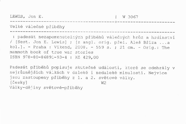 Uznávaný britský historik J. E. Lewis sestavil zajímavou knihu, obsahující padesát skutečných válečných příběhů. 550 stránek textu popisuje otřesné i dojemné válečné příběhy, které se udály od starověku po naši současnost. Autor zařadil události, které se odehrály na různých kontinentech a v různých dobách, na souši, ve vzduchu nebo na moři. Hrdinové příběhů jsou slavné historické osobnosti (Alexandr Veliký, Caesar), ale též obyčejní vojáci nebo vojáci mimořádně stateční a úspěšní v boji (letecká, námořní esa). Příběhy přibližují atmosféru bitev a ukazují i zákulisí bojů, pocity a osudy prostých vojáků. Nejvíce příběhů je z první a druhé světové války, dále z válek napoleonských a starověkých. Na závěr seznam pramenů.