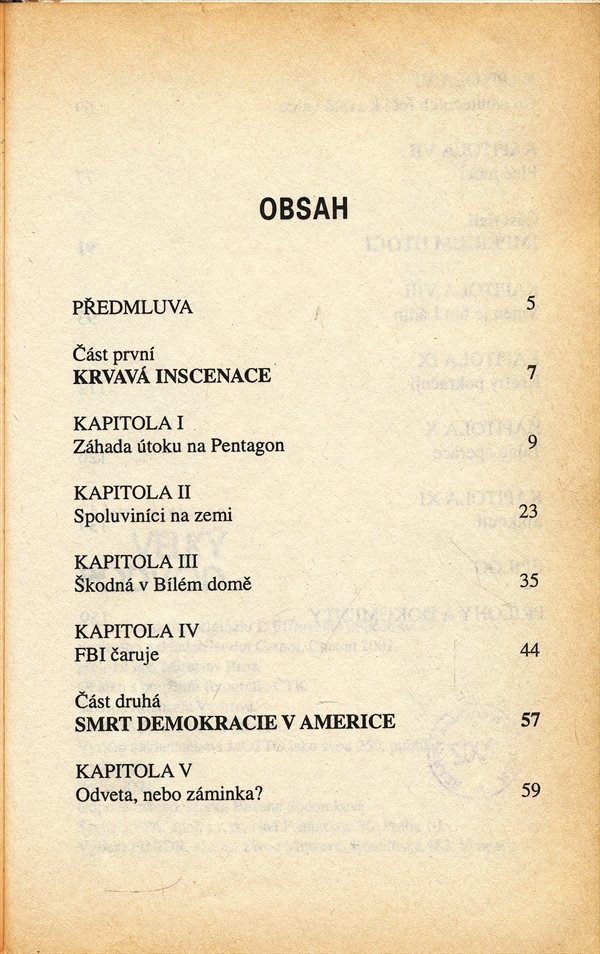 Konfrontací oficiální verze události s dokumenty a výpověďmi očitých svědků dochází k šokujícímu závěru: na sídlo Ministerstva obrany USA žádné letadlo nespadlo. Spekulativní polemická publicistika. Přílohu tvoří oficiální dokumenty (např. nóty Ministerstva zahraničí USA, projevy nejvyšších představitelů státu atd.).