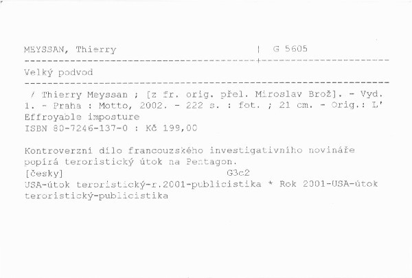 | Autor | Thierry Meyssan ; [z fr. orig. přel. Miroslav Brož] |