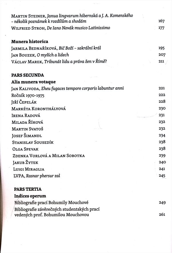 Sborník příspěvků k 80. narozeninám české klasické filoložky (latina), vysokoškolské učitelky a překladatelky B. Mouchové.